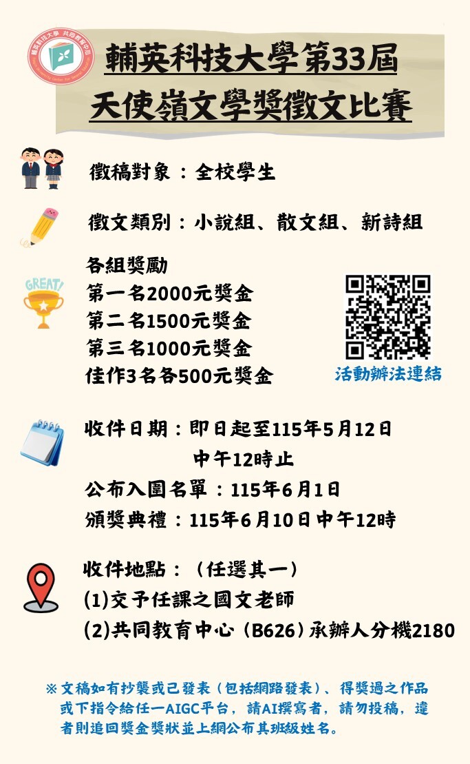 114-2第三十三屆天使嶺文學獎徵文比賽【活動進行中】